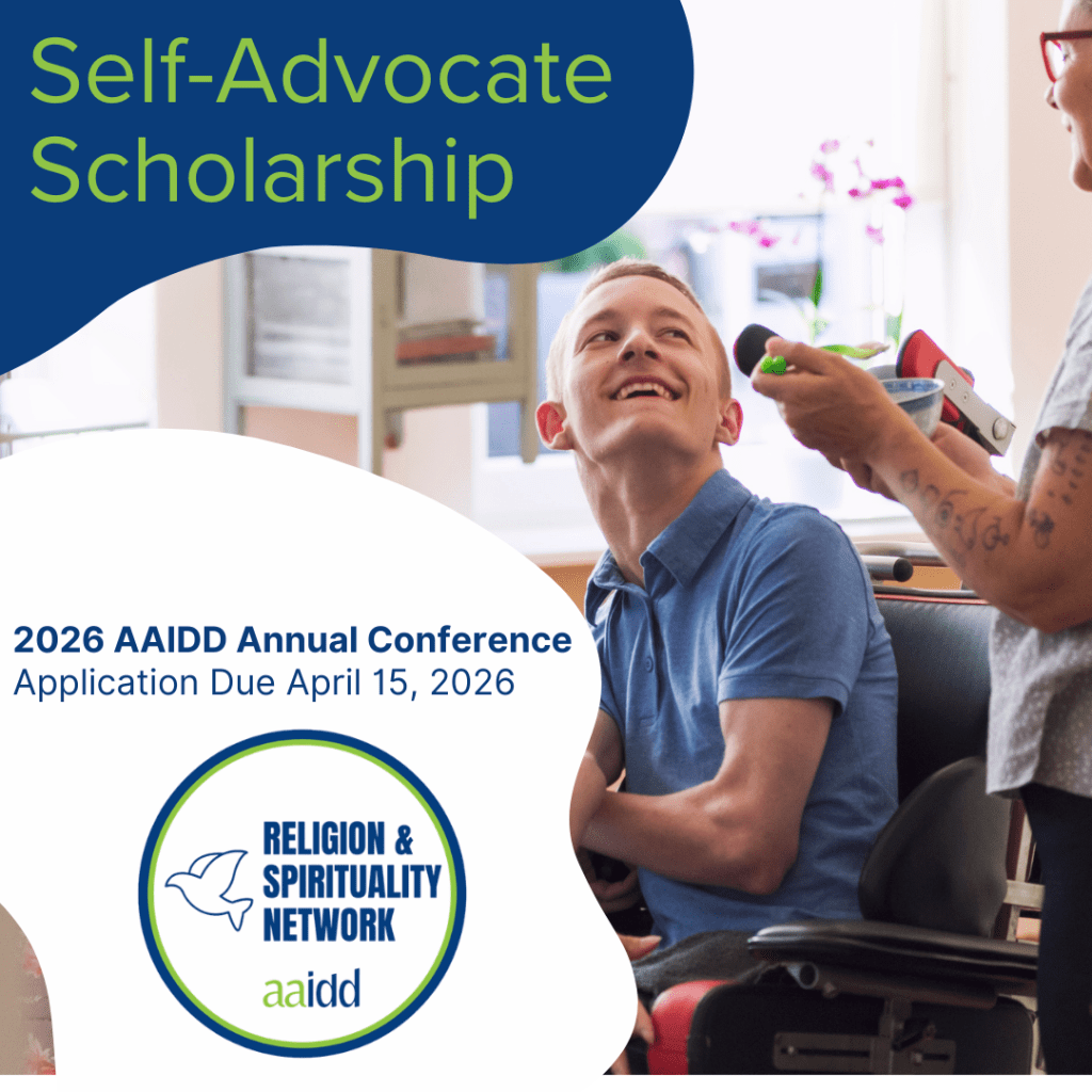The AAIDD Religion and Spirituality Interest Network is committed to including people with intellectual and developmental disabilities in the AAIDD annual national conference. We have funds to provide a $500 scholarship for one adult with intellectual or developmental disability who is involved in self-advocacy and is interested in attending the AAIDD Annual Meeting.